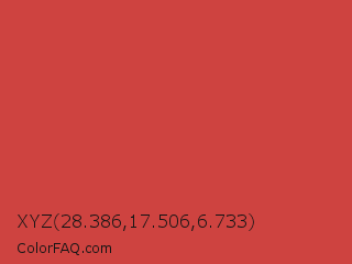 XYZ 28.386,17.506,6.733 Color is a normal red color and the nearest color is English Vermillion #cc474b. Hex code #ce4340 and RGB value is rgb(206,67,64). In RGB color space, this color is composed of 81% red, 26% green, 25% blue, In CMYK color space, this color is composed of 0% cyan, 67% magenta, 69% yellow , 19% black , In HSL color space, this color has a hue angle of 1° , 59% saturation and 53% lightness.