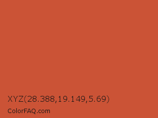 XYZ 28.388,19.149,5.69 Color is a normal red color and the nearest color is Mojo #c04737. Hex code #cb5336 and RGB value is rgb(203,83,54). In RGB color space, this color is composed of 80% red, 33% green, 21% blue, In CMYK color space, this color is composed of 0% cyan, 59% magenta, 73% yellow , 20% black , In HSL color space, this color has a hue angle of 12° , 59% saturation and 50% lightness.