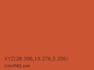 XYZ 28.396,19.276,5.356 Color is a normal red color and the nearest color is Flame Pea #da5b38. Hex code #cb5433 and RGB value is rgb(203,84,51). In RGB color space, this color is composed of 80% red, 33% green, 20% blue, In CMYK color space, this color is composed of 0% cyan, 59% magenta, 75% yellow , 20% black , In HSL color space, this color has a hue angle of 13° , 60% saturation and 50% lightness.