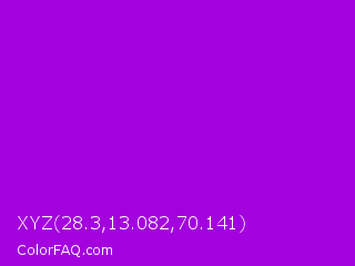XYZ 28.3,13.082,70.141 Color is a normal purple color and the nearest color is Dark Violet #9400d3. Hex code #a301de and RGB value is rgb(163,1,222). In RGB color space, this color is composed of 64% red, 0% green, 87% blue, In CMYK color space, this color is composed of 27% cyan, 100% magenta, 0% yellow , 13% black , In HSL color space, this color has a hue angle of 284° , 99% saturation and 44% lightness.