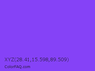 XYZ 28.41,15.598,89.509 Color is a light violet color and the nearest color is Navy Purple #9457eb. Hex code #8542f7 and RGB value is rgb(133,66,247). In RGB color space, this color is composed of 52% red, 26% green, 97% blue, In CMYK color space, this color is composed of 46% cyan, 73% magenta, 0% yellow , 3% black , In HSL color space, this color has a hue angle of 262° , 92% saturation and 61% lightness.