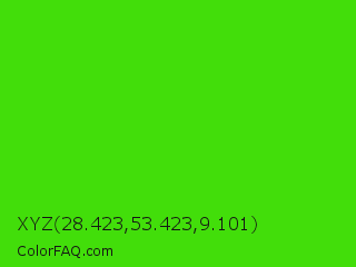 XYZ 28.423,53.423,9.101 Color is a normal green color and the nearest color is Harlequin Green #46cb18. Hex code #42de0a and RGB value is rgb(66,222,10). In RGB color space, this color is composed of 26% red, 87% green, 4% blue, In CMYK color space, this color is composed of 70% cyan, 0% magenta, 95% yellow , 13% black , In HSL color space, this color has a hue angle of 104° , 91% saturation and 45% lightness.