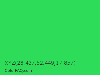 XYZ 28.437,52.449,17.857 Color is a normal green color and the nearest color is UFO Green #3cd070. Hex code #2ddc58 and RGB value is rgb(45,220,88). In RGB color space, this color is composed of 18% red, 86% green, 35% blue, In CMYK color space, this color is composed of 80% cyan, 0% magenta, 60% yellow , 14% black , In HSL color space, this color has a hue angle of 135° , 71% saturation and 52% lightness.