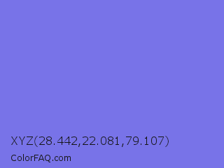 XYZ 28.442,22.081,79.107 Color is a light indigo color and the nearest color is Medium Slate Blue #7b68ee. Hex code #7873e8 and RGB value is rgb(120,115,232). In RGB color space, this color is composed of 47% red, 45% green, 91% blue, In CMYK color space, this color is composed of 48% cyan, 50% magenta, 0% yellow , 9% black , In HSL color space, this color has a hue angle of 243° , 72% saturation and 68% lightness.