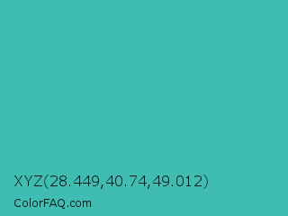 XYZ 28.449,40.74,49.012 Color is a normal cyan color and the nearest color is Puerto Rico #3fc1aa. Hex code #40bdb3 and RGB value is rgb(64,189,179). In RGB color space, this color is composed of 25% red, 74% green, 70% blue, In CMYK color space, this color is composed of 66% cyan, 0% magenta, 5% yellow , 26% black , In HSL color space, this color has a hue angle of 175° , 49% saturation and 50% lightness.