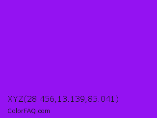 XYZ 28.456,13.139,85.041 Color is a normal purple color and the nearest color is Veronica #a020f0. Hex code #9412f2 and RGB value is rgb(148,18,242). In RGB color space, this color is composed of 58% red, 7% green, 95% blue, In CMYK color space, this color is composed of 39% cyan, 93% magenta, 0% yellow , 5% black , In HSL color space, this color has a hue angle of 275° , 90% saturation and 51% lightness.
