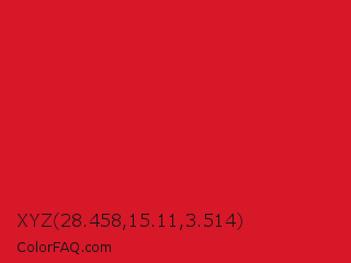 XYZ 28.458,15.11,3.514 Color is a normal red color and the nearest color is Amaranth Red #d3212d. Hex code #d61829 and RGB value is rgb(214,24,41). In RGB color space, this color is composed of 84% red, 9% green, 16% blue, In CMYK color space, this color is composed of 0% cyan, 89% magenta, 81% yellow , 16% black , In HSL color space, this color has a hue angle of 355° , 80% saturation and 47% lightness.
