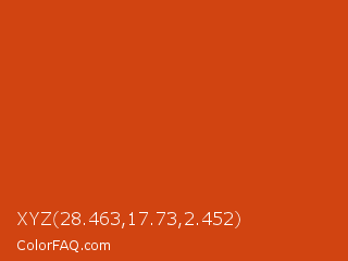 XYZ 28.463,17.73,2.452 Color is a normal orange color and the nearest color is Sinopia #cb410b. Hex code #d14411 and RGB value is rgb(209,68,17). In RGB color space, this color is composed of 82% red, 27% green, 7% blue, In CMYK color space, this color is composed of 0% cyan, 67% magenta, 92% yellow , 18% black , In HSL color space, this color has a hue angle of 16° , 85% saturation and 44% lightness.