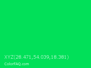 XYZ 28.471,54.039,18.381 Color is a normal green color and the nearest color is Malachite #0bda51. Hex code #01e059 and RGB value is rgb(1,224,89). In RGB color space, this color is composed of 0% red, 88% green, 35% blue, In CMYK color space, this color is composed of 100% cyan, 0% magenta, 60% yellow , 12% black , In HSL color space, this color has a hue angle of 144° , 99% saturation and 44% lightness.