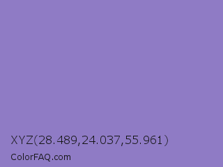 XYZ 28.489,24.037,55.961 Color is a light indigo color and the nearest color is Ube #8878c3. Hex code #8f7bc5 and RGB value is rgb(143,123,197). In RGB color space, this color is composed of 56% red, 48% green, 77% blue, In CMYK color space, this color is composed of 27% cyan, 38% magenta, 0% yellow , 23% black , In HSL color space, this color has a hue angle of 256° , 39% saturation and 63% lightness.