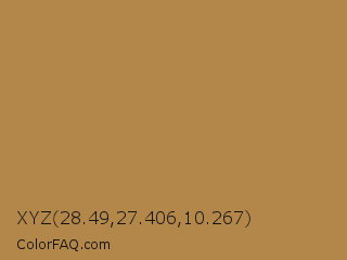 XYZ 28.49,27.406,10.267 Color is a normal orange color and the nearest color is Driftwood #af8751. Hex code #b3874a and RGB value is rgb(179,135,74). In RGB color space, this color is composed of 70% red, 53% green, 29% blue, In CMYK color space, this color is composed of 0% cyan, 25% magenta, 59% yellow , 30% black , In HSL color space, this color has a hue angle of 35° , 42% saturation and 50% lightness.