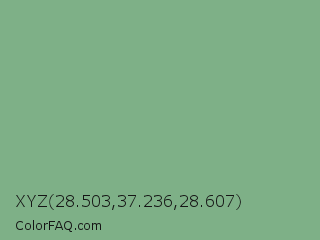 XYZ 28.503,37.236,28.607 Color is a normal green color and the nearest color is Bay Leaf #7da98d. Hex code #7eb087 and RGB value is rgb(126,176,135). In RGB color space, this color is composed of 49% red, 69% green, 53% blue, In CMYK color space, this color is composed of 28% cyan, 0% magenta, 23% yellow , 31% black , In HSL color space, this color has a hue angle of 131° , 24% saturation and 59% lightness.