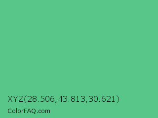 XYZ 28.506,43.813,30.621 Color is a normal green color and the nearest color is Ocean Green #48bf91. Hex code #58c589 and RGB value is rgb(88,197,137). In RGB color space, this color is composed of 35% red, 77% green, 54% blue, In CMYK color space, this color is composed of 55% cyan, 0% magenta, 30% yellow , 23% black , In HSL color space, this color has a hue angle of 147° , 48% saturation and 56% lightness.