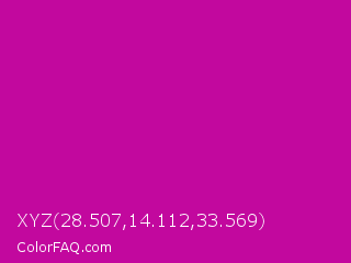 XYZ 28.507,14.112,33.569 Color is a normal magenta color and the nearest color is Red Violet #c71585. Hex code #c2089e and RGB value is rgb(194,8,158). In RGB color space, this color is composed of 76% red, 3% green, 62% blue, In CMYK color space, this color is composed of 0% cyan, 96% magenta, 19% yellow , 24% black , In HSL color space, this color has a hue angle of 312° , 92% saturation and 40% lightness.
