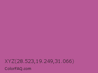 XYZ 28.523,19.249,31.066 Color is a normal magenta color and the nearest color is Pearly Purple #b768a2. Hex code #b75896 and RGB value is rgb(183,88,150). In RGB color space, this color is composed of 72% red, 35% green, 59% blue, In CMYK color space, this color is composed of 0% cyan, 52% magenta, 18% yellow , 28% black , In HSL color space, this color has a hue angle of 321° , 40% saturation and 53% lightness.