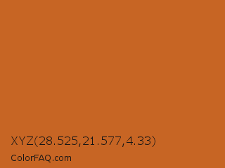 XYZ 28.525,21.577,4.33 Color is a normal orange color and the nearest color is Piper #c96323. Hex code #c76524 and RGB value is rgb(199,101,36). In RGB color space, this color is composed of 78% red, 40% green, 14% blue, In CMYK color space, this color is composed of 0% cyan, 49% magenta, 82% yellow , 22% black , In HSL color space, this color has a hue angle of 24° , 69% saturation and 46% lightness.