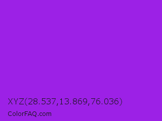 XYZ 28.537,13.869,76.036 Color is a normal purple color and the nearest color is Veronica #a020f0. Hex code #9c21e6 and RGB value is rgb(156,33,230). In RGB color space, this color is composed of 61% red, 13% green, 90% blue, In CMYK color space, this color is composed of 32% cyan, 86% magenta, 0% yellow , 10% black , In HSL color space, this color has a hue angle of 277° , 80% saturation and 52% lightness.