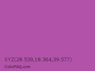 XYZ 28.539,18.364,39.577 Color is a normal magenta color and the nearest color is Pearly Purple #b768a2. Hex code #b252a9 and RGB value is rgb(178,82,169). In RGB color space, this color is composed of 70% red, 32% green, 66% blue, In CMYK color space, this color is composed of 0% cyan, 54% magenta, 5% yellow , 30% black , In HSL color space, this color has a hue angle of 306° , 38% saturation and 51% lightness.