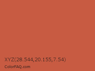 XYZ 28.544,20.155,7.54 Color is a normal red color and the nearest color is Dark Coral #cd5b45. Hex code #c85b42 and RGB value is rgb(200,91,66). In RGB color space, this color is composed of 78% red, 36% green, 26% blue, In CMYK color space, this color is composed of 0% cyan, 55% magenta, 67% yellow , 22% black , In HSL color space, this color has a hue angle of 11° , 55% saturation and 52% lightness.