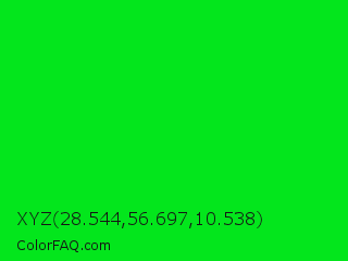 XYZ 28.544,56.697,10.538 Color is a normal green color and the nearest color is Vivid Malachite #00cc33. Hex code #03e61c and RGB value is rgb(3,230,28). In RGB color space, this color is composed of 1% red, 90% green, 11% blue, In CMYK color space, this color is composed of 99% cyan, 0% magenta, 88% yellow , 10% black , In HSL color space, this color has a hue angle of 127° , 97% saturation and 46% lightness.