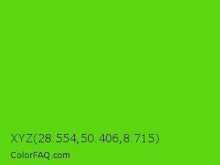 XYZ 28.554,50.406,8.715 Color is a normal green color and the nearest color is Harlequin Green #46cb18. Hex code #5cd610 and RGB value is rgb(92,214,16). In RGB color space, this color is composed of 36% red, 84% green, 6% blue, In CMYK color space, this color is composed of 57% cyan, 0% magenta, 93% yellow , 16% black , In HSL color space, this color has a hue angle of 97° , 86% saturation and 45% lightness.