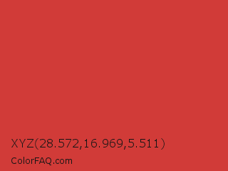 XYZ 28.572,16.969,5.511 Color is a normal red color and the nearest color is Jasper #d73b3e. Hex code #d13b38 and RGB value is rgb(209,59,56). In RGB color space, this color is composed of 82% red, 23% green, 22% blue, In CMYK color space, this color is composed of 0% cyan, 72% magenta, 73% yellow , 18% black , In HSL color space, this color has a hue angle of 1° , 62% saturation and 52% lightness.