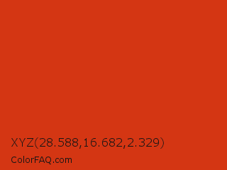XYZ 28.588,16.682,2.329 Color is a normal red color and the nearest color is Vermilion #d9381e. Hex code #d43613 and RGB value is rgb(212,54,19). In RGB color space, this color is composed of 83% red, 21% green, 7% blue, In CMYK color space, this color is composed of 0% cyan, 75% magenta, 91% yellow , 17% black , In HSL color space, this color has a hue angle of 11° , 84% saturation and 45% lightness.