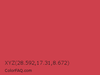 XYZ 28.592,17.31,8.672 Color is a normal red color and the nearest color is English Vermillion #cc474b. Hex code #ce404c and RGB value is rgb(206,64,76). In RGB color space, this color is composed of 81% red, 25% green, 30% blue, In CMYK color space, this color is composed of 0% cyan, 69% magenta, 63% yellow , 19% black , In HSL color space, this color has a hue angle of 355° , 59% saturation and 53% lightness.