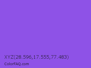 XYZ 28.596,17.555,77.483 Color is a light violet color and the nearest color is Navy Purple #9457eb. Hex code #8e52e7 and RGB value is rgb(142,82,231). In RGB color space, this color is composed of 56% red, 32% green, 91% blue, In CMYK color space, this color is composed of 39% cyan, 65% magenta, 0% yellow , 9% black , In HSL color space, this color has a hue angle of 264° , 76% saturation and 61% lightness.