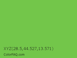XYZ 28.5,44.527,13.571 Color is a normal green color and the nearest color is Mantis #74c365. Hex code #73c64a and RGB value is rgb(115,198,74). In RGB color space, this color is composed of 45% red, 78% green, 29% blue, In CMYK color space, this color is composed of 42% cyan, 0% magenta, 63% yellow , 22% black , In HSL color space, this color has a hue angle of 100° , 52% saturation and 53% lightness.