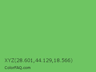 XYZ 28.601,44.129,18.566 Color is a normal green color and the nearest color is Mantis #74c365. Hex code #6ec562 and RGB value is rgb(110,197,98). In RGB color space, this color is composed of 43% red, 77% green, 38% blue, In CMYK color space, this color is composed of 44% cyan, 0% magenta, 50% yellow , 23% black , In HSL color space, this color has a hue angle of 113° , 46% saturation and 58% lightness.