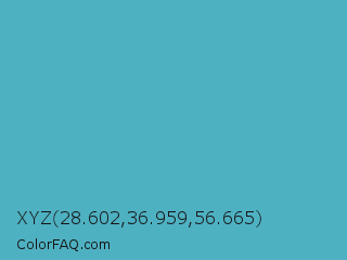 XYZ 28.602,36.959,56.665 Color is a normal cyan color and the nearest color is Fountain Blue #56b4be. Hex code #4eb1c2 and RGB value is rgb(78,177,194). In RGB color space, this color is composed of 31% red, 69% green, 76% blue, In CMYK color space, this color is composed of 60% cyan, 9% magenta, 0% yellow , 24% black , In HSL color space, this color has a hue angle of 189° , 49% saturation and 53% lightness.