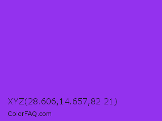 XYZ 28.606,14.657,82.21 Color is a normal purple color and the nearest color is Blue Violet #8a2be2. Hex code #9332ee and RGB value is rgb(147,50,238). In RGB color space, this color is composed of 58% red, 20% green, 93% blue, In CMYK color space, this color is composed of 38% cyan, 79% magenta, 0% yellow , 7% black , In HSL color space, this color has a hue angle of 271° , 85% saturation and 56% lightness.