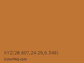 XYZ 28.607,24.29,6.549 Color is a normal orange color and the nearest color is Copper #b87333. Hex code #bf7635 and RGB value is rgb(191,118,53). In RGB color space, this color is composed of 75% red, 46% green, 21% blue, In CMYK color space, this color is composed of 0% cyan, 38% magenta, 72% yellow , 25% black , In HSL color space, this color has a hue angle of 28° , 57% saturation and 48% lightness.