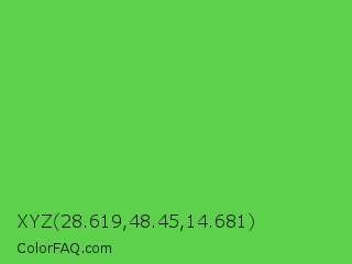 XYZ 28.619,48.45,14.681 Color is a normal green color and the nearest color is Mantis #74c365. Hex code #5dd14c and RGB value is rgb(93,209,76). In RGB color space, this color is composed of 36% red, 82% green, 30% blue, In CMYK color space, this color is composed of 56% cyan, 0% magenta, 64% yellow , 18% black , In HSL color space, this color has a hue angle of 112° , 59% saturation and 56% lightness.