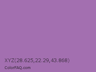 XYZ 28.625,22.29,43.868 Color is a normal purple color and the nearest color is Wisteria #9771b5. Hex code #a36fb0 and RGB value is rgb(163,111,176). In RGB color space, this color is composed of 64% red, 44% green, 69% blue, In CMYK color space, this color is composed of 7% cyan, 37% magenta, 0% yellow , 31% black , In HSL color space, this color has a hue angle of 288° , 29% saturation and 56% lightness.