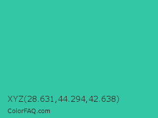 XYZ 28.631,44.294,42.638 Color is a normal cyan color and the nearest color is Shamrock #33cc99. Hex code #34c7a5 and RGB value is rgb(52,199,165). In RGB color space, this color is composed of 20% red, 78% green, 65% blue, In CMYK color space, this color is composed of 74% cyan, 0% magenta, 17% yellow , 22% black , In HSL color space, this color has a hue angle of 166° , 59% saturation and 49% lightness.