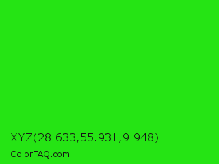 XYZ 28.633,55.931,9.948 Color is a normal green color and the nearest color is Neon Green #39ff14. Hex code #25e414 and RGB value is rgb(37,228,20). In RGB color space, this color is composed of 15% red, 89% green, 8% blue, In CMYK color space, this color is composed of 84% cyan, 0% magenta, 91% yellow , 11% black , In HSL color space, this color has a hue angle of 115° , 84% saturation and 49% lightness.