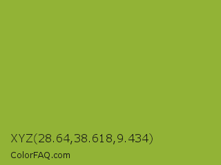 XYZ 28.64,38.618,9.434 Color is a normal lime color and the nearest color is Sushi #87ab39. Hex code #92b336 and RGB value is rgb(146,179,54). In RGB color space, this color is composed of 57% red, 70% green, 21% blue, In CMYK color space, this color is composed of 18% cyan, 0% magenta, 70% yellow , 30% black , In HSL color space, this color has a hue angle of 76° , 54% saturation and 46% lightness.
