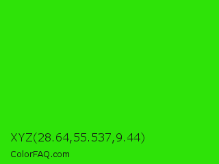 XYZ 28.64,55.537,9.44 Color is a normal green color and the nearest color is Neon Green #39ff14. Hex code #2ee308 and RGB value is rgb(46,227,8). In RGB color space, this color is composed of 18% red, 89% green, 3% blue, In CMYK color space, this color is composed of 80% cyan, 0% magenta, 96% yellow , 11% black , In HSL color space, this color has a hue angle of 110° , 93% saturation and 46% lightness.