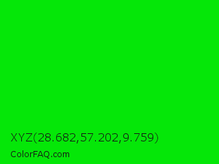 XYZ 28.682,57.202,9.759 Color is a normal green color and the nearest color is Green #00ff00. Hex code #05e708 and RGB value is rgb(5,231,8). In RGB color space, this color is composed of 2% red, 91% green, 3% blue, In CMYK color space, this color is composed of 98% cyan, 0% magenta, 97% yellow , 9% black , In HSL color space, this color has a hue angle of 121° , 96% saturation and 46% lightness.