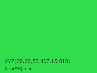 XYZ 28.68,53.407,15.818 Color is a normal green color and the nearest color is Lime Green #32cd32. Hex code #30de4d and RGB value is rgb(48,222,77). In RGB color space, this color is composed of 19% red, 87% green, 30% blue, In CMYK color space, this color is composed of 78% cyan, 0% magenta, 65% yellow , 13% black , In HSL color space, this color has a hue angle of 130° , 73% saturation and 53% lightness.