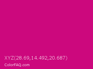 XYZ 28.69,14.492,20.687 Color is a normal magenta color and the nearest color is Red Violet #c71585. Hex code #cc087d and RGB value is rgb(204,8,125). In RGB color space, this color is composed of 80% red, 3% green, 49% blue, In CMYK color space, this color is composed of 0% cyan, 96% magenta, 39% yellow , 20% black , In HSL color space, this color has a hue angle of 324° , 92% saturation and 42% lightness.