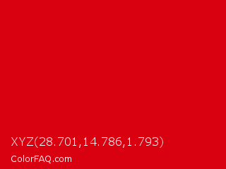 XYZ 28.701,14.786,1.793 Color is a normal red color and the nearest color is KU Crimson #e8000d. Hex code #d9000f and RGB value is rgb(217,0,15). In RGB color space, this color is composed of 85% red, 0% green, 6% blue, In CMYK color space, this color is composed of 0% cyan, 100% magenta, 93% yellow , 15% black , In HSL color space, this color has a hue angle of 356° , 100% saturation and 43% lightness.
