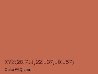 XYZ 28.711,22.137,10.157 Color is a normal red color and the nearest color is Copper Red #cb6d51. Hex code #c2694f and RGB value is rgb(194,105,79). In RGB color space, this color is composed of 76% red, 41% green, 31% blue, In CMYK color space, this color is composed of 0% cyan, 46% magenta, 59% yellow , 24% black , In HSL color space, this color has a hue angle of 14° , 49% saturation and 54% lightness.