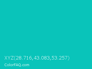 XYZ 28.716,43.083,53.257 Color is a normal cyan color and the nearest color is Tiffany Blue #0abab5. Hex code #09c4ba and RGB value is rgb(9,196,186). In RGB color space, this color is composed of 4% red, 77% green, 73% blue, In CMYK color space, this color is composed of 95% cyan, 0% magenta, 5% yellow , 23% black , In HSL color space, this color has a hue angle of 177° , 91% saturation and 40% lightness.
