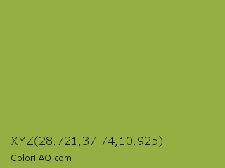 XYZ 28.721,37.74,10.925 Color is a normal lime color and the nearest color is Sushi #87ab39. Hex code #94b042 and RGB value is rgb(148,176,66). In RGB color space, this color is composed of 58% red, 69% green, 26% blue, In CMYK color space, this color is composed of 16% cyan, 0% magenta, 63% yellow , 31% black , In HSL color space, this color has a hue angle of 75° , 45% saturation and 47% lightness.