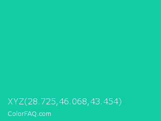 XYZ 28.725,46.068,43.454 Color is a normal cyan color and the nearest color is Amazonite #00c4b0. Hex code #12cca6 and RGB value is rgb(18,204,166). In RGB color space, this color is composed of 7% red, 80% green, 65% blue, In CMYK color space, this color is composed of 91% cyan, 0% magenta, 19% yellow , 20% black , In HSL color space, this color has a hue angle of 168° , 84% saturation and 44% lightness.