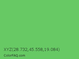 XYZ 28.732,45.558,19.084 Color is a normal green color and the nearest color is Mantis #74c365. Hex code #67c963 and RGB value is rgb(103,201,99). In RGB color space, this color is composed of 40% red, 79% green, 39% blue, In CMYK color space, this color is composed of 49% cyan, 0% magenta, 51% yellow , 21% black , In HSL color space, this color has a hue angle of 118° , 49% saturation and 59% lightness.