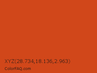 XYZ 28.734,18.136,2.963 Color is a normal color and the nearest color is Sinopia #cb410b. Hex code #d1471a and RGB value is rgb(209,71,26). In RGB color space, this color is composed of 82% red, 28% green, 10% blue, In CMYK color space, this color is composed of 0% cyan, 66% magenta, 88% yellow , 18% black , In HSL color space, this color has a hue angle of 15° , 78% saturation and 46% lightness.
